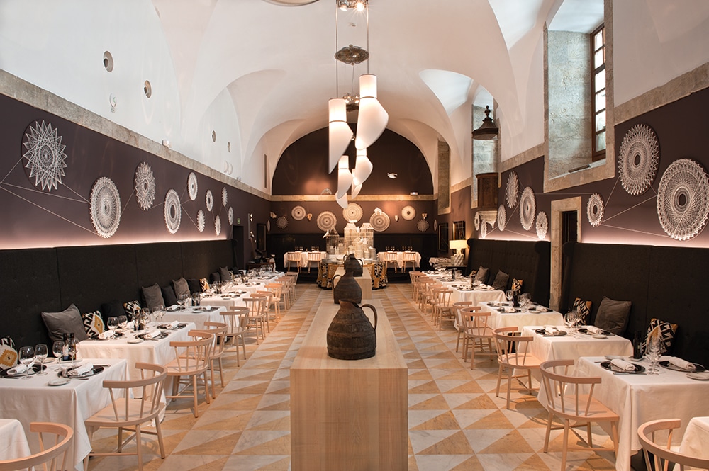 The building’s interior has a marked monastic quality, with stone walls and vaulted ceilings, but with a contemporary edge that includes avant-garde wooden chairs and splash-bright crimson tables.