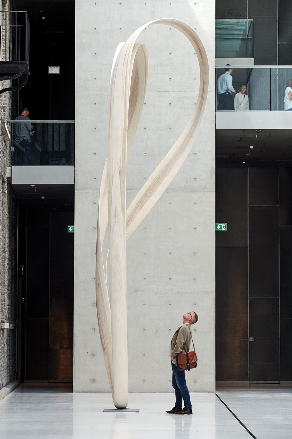 Above: Magnus Modus, a seven-metre-high, free-form sculpture made of multiple layers of laminated olive ash wood that is on permanent collection in the courtyard of the National Gallery of Ireland. Resting upon a small Kilkenny marble base, the Magnus Modus delineates space in its slender aspect, stationed on a tiny footprint, reaching upwards and then outwards. As the sculpture ascends, it becomes lighter and reacts to subtle changes in the atmosphere.