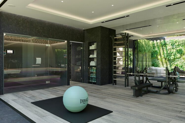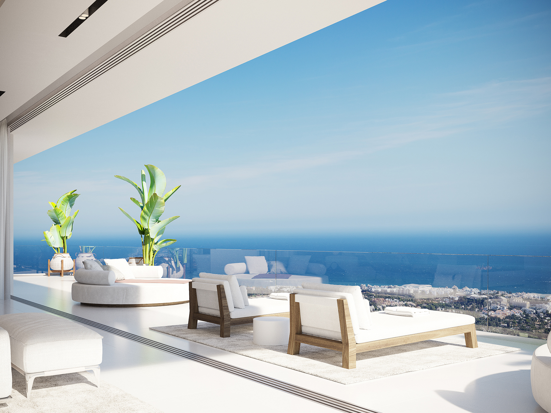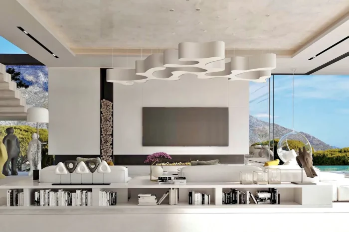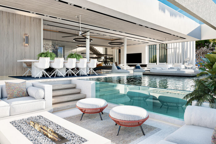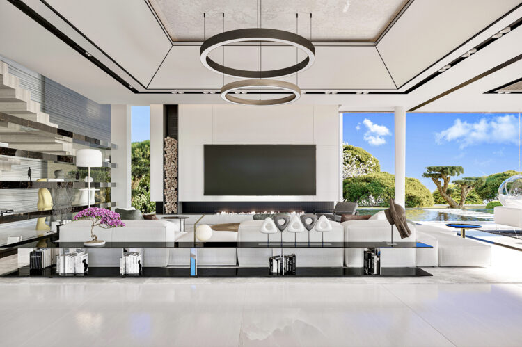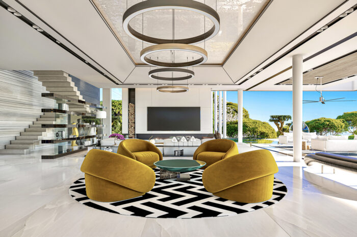 Villa Ibiza was designed around the views. The overall design is thus as simple as possible while also being stylish, elegant, exciting and functional. Clean cantilevered shapes, broad areas of glass, natural materials, plenty of reflecting water just in front of the house and a garden designed to slip in unobtrusively with the landscape all around. The pool feels like it’s wrapped around the villa. You look out from any part of the house and see this large body of water blending into the blue horizon, because it’s a true infinity pool. Walking into the villa the first thing you see is a “conversation area” – because if you want to enjoy good conversation, you need to create a space to have it. The colour scheme has just enough colour to brighten up the space and catch our attention, but not so much that it overwhelms.