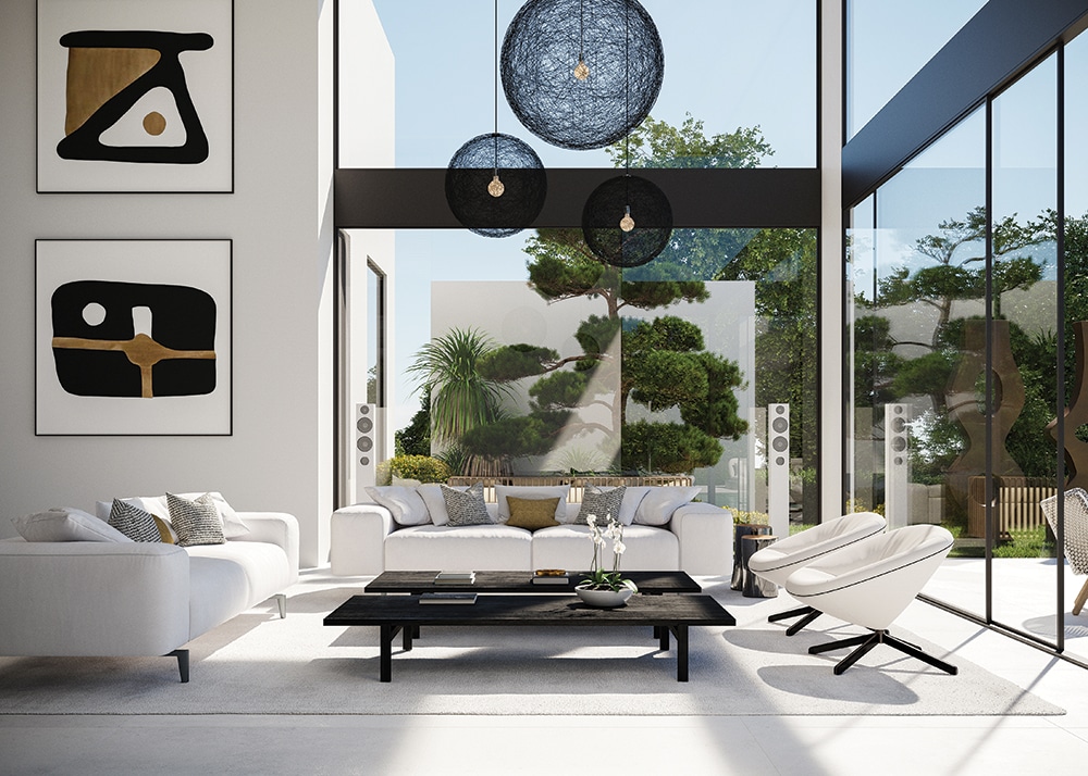 Nature plays an important part in achieving this: a garden designed in signature UDesign style, bringing bonsai trees and plants into the living space, blurring the line between outdoors and indoors. This effect is taken further by the choice of main materials – wood and natural stone prevail – creating a minimalist, almost Japanese feel.